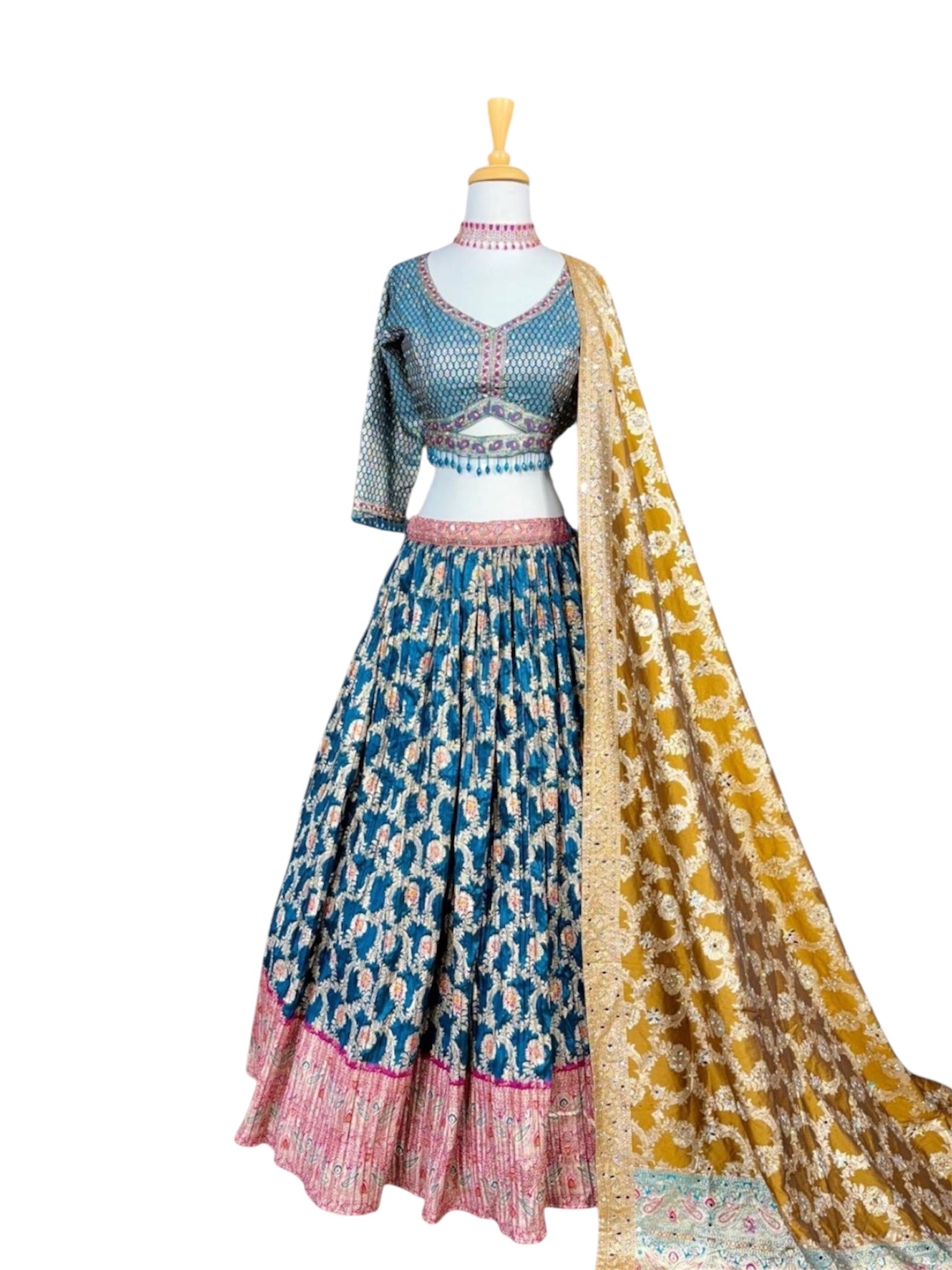 Elevate your ethnic style with this stunning Blue & Mustard Lehenga